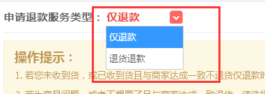 2)若为商品问题或其它原因且与商家达成一致退货,请选择“退货退款”选项,退货后请保留物流底单。