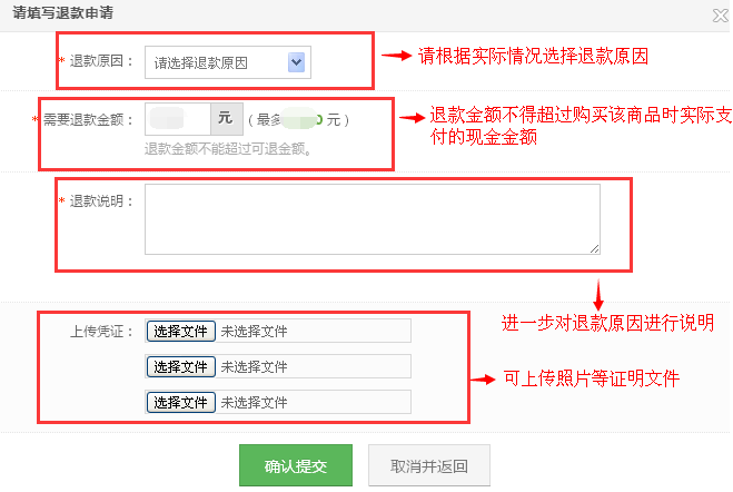 2)退货退款:根据要求填写退款信息并提交 。
