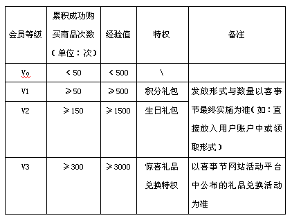 所有注册喜事节的用户即为喜事节的会员。用户会员主要分为4个等级:Vo、V1、V2、V3,等级划分以用户的经验值为标准。在喜事节成功购买商品1次获得10分经验值,不同等级会员享有不同特权。